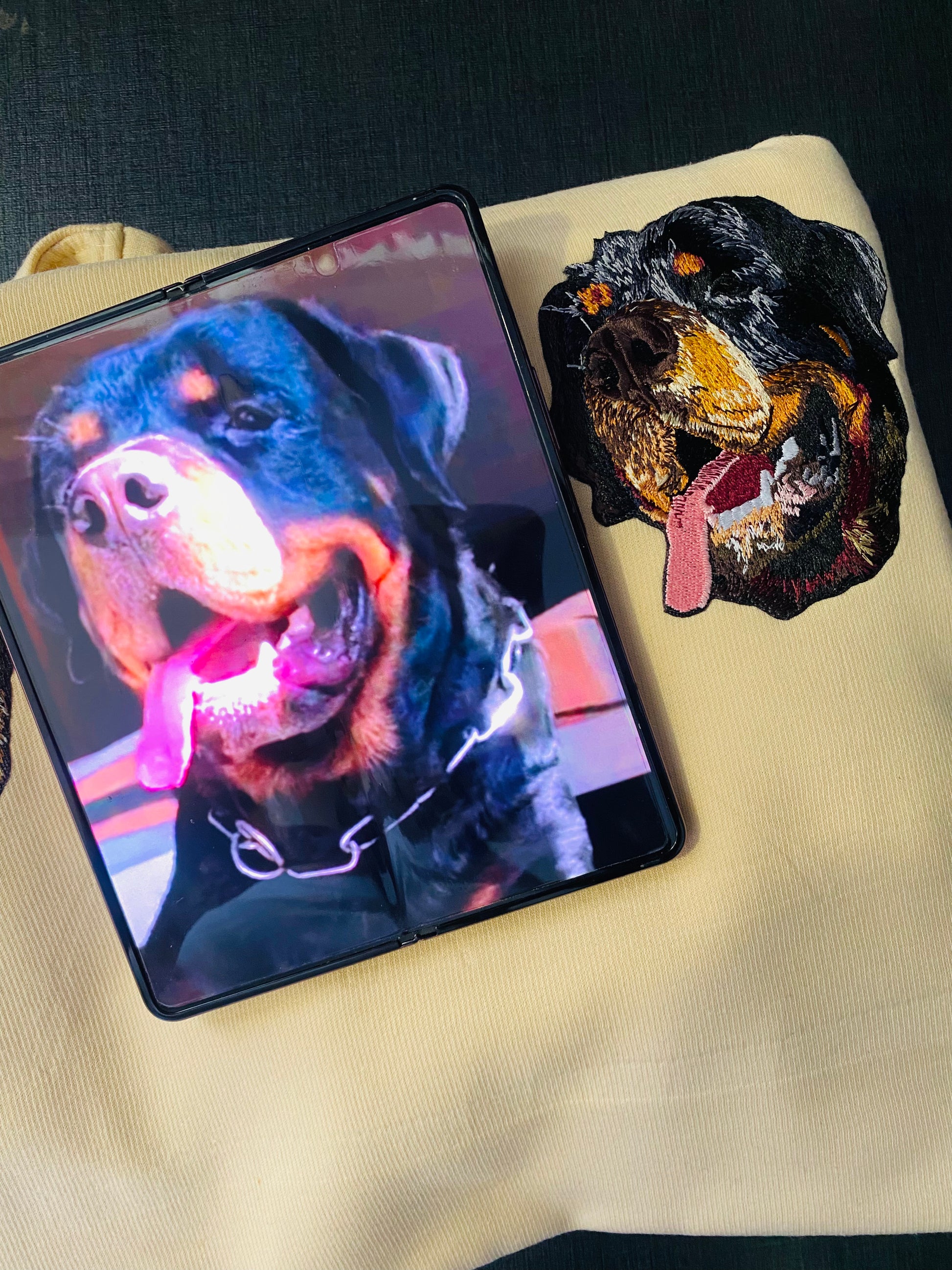- Custom pet portrait embroidery for a personal touch