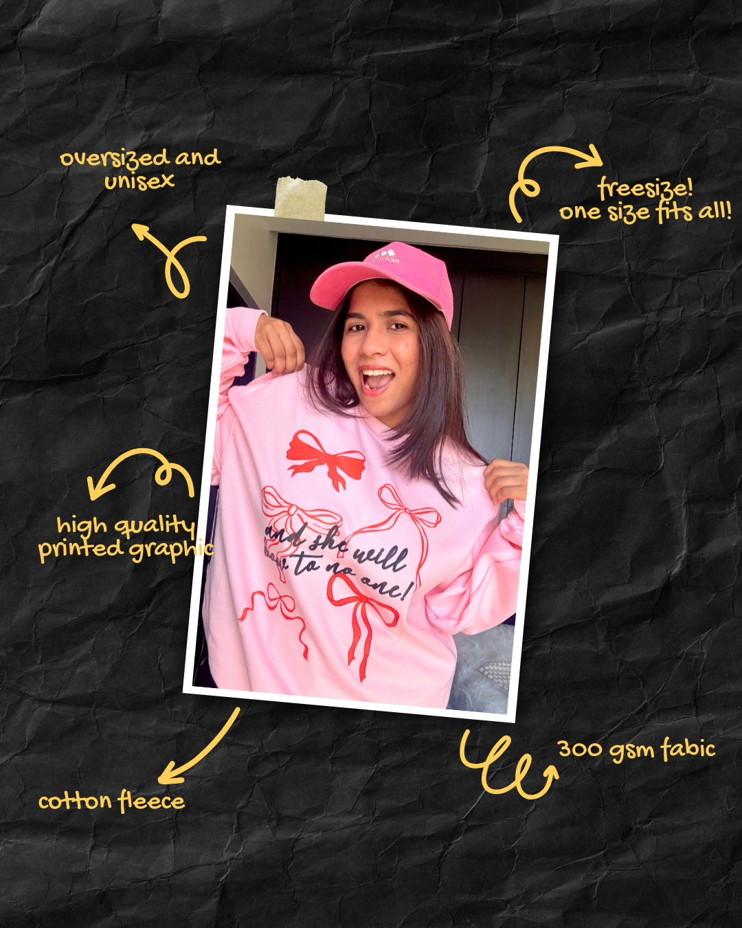Effortlessly cool and insanely comfy, this Pinterest-inspired oversized sweatshirt is the statement piece your wardrobe needs. Made from premium 300 GSM fabric, it’s ultra-soft, warm, and built for all-day coziness. Designed for a relaxed, free-size fit (46-48 inches), it drapes just right—giving you that effortlessly stylish, oversized look.